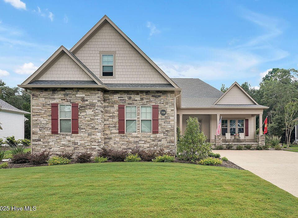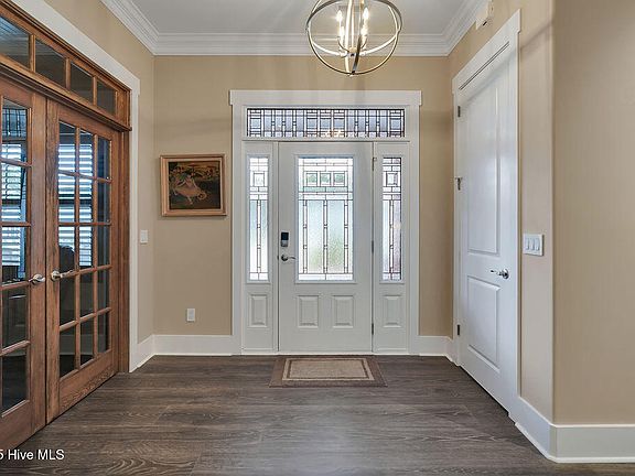Located in the Bluffs on the Cape Fear, home offers 3 beds, 2.5 baths, an oversized 2-car garage, office, large sunroom, and an impressive outdoor oasis. Attention to detail is found throughout, including wood-look luxury vinyl plank floors in main living areas, quartz countertops, coffered & trey ceilings, French door & pocket door entryways, upgraded window treatments, wood shelving and hanging bars, and more. The lush landscaping, stacked stone accents, and covered front porch add to the alluring curb appeal. The natural gas fireplace and built-in cabinetry & shelving create a stylish focal point in the open living room. A center island, along with upgraded white cabinets with gray accent trim, are found in the kitchen, as well as pantry cabinets, a gas cooktop, built-in microwave & convection oven. The heated & cooled sunroom includes motorized shades allowing you to set the mood for any occasion. Two walk-in closets, a walk-in tiled frameless shower, separate vanities, and linen closet, are found in the primary suite. Laundry room includes a sink, cabinetry, folding counter, and the washer & dryer convey. A dedicated office, two guest bedrooms, full bath, and a half bath, complete the interior rooms. A built-in workbench, storage cubbies, shelving, utility door, and access to the floored attic, are found within the insulated, oversized garage, with the freezer conveying. Outside, enjoy laps in the saltwater heated & cooled pool with fountain waterfalls, unwind in the spa, surrounded by travertine deck, jasmine-covered trellises, and louvered fencing. Relax in the cabana with its wood-burning brick fireplace or rinse off using the outdoor shower. Additionally, the home includes a raised bed garden area, whole home generator, tankless water heater, gutter guards, extensive exterior lighting on timers, and a four-zone music system. The Bluffs is an amenity-rich community offering a lake, boat/RV storage area, a private beach club on Oak Island, and much more.
