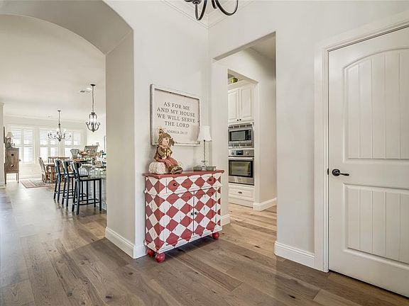 Nestled on the 16th fairway of The Golf Club of Edmond, this beautiful home in Fairfax Estates combines elegance, comfort, and functionality. The open-concept design features a spacious living room with crown molding, built-ins, and a cozy fireplace, flowing seamlessly into a chef’s kitchen with a large island, farmhouse sink, stainless steel appliances, abundant storage, and a butler’s pantry. The primary suite is a true retreat, offering double vanities, a soaking tub, and a walk-in shower with dual shower heads, plus a huge closet that conveniently connects to the laundry room. Upstairs, a versatile flex space with its own half bath provides endless options, second living area, guest suite, workout room, or theatre, and includes a walk-out attic with abundant storage just around the corner. The thoughtful layout continues with a three-car tandem garage and a practical hallway from the garage featuring a built-in hall tree, bathroom, and laundry access. Residents enjoy neighborhood amenities including a pool, splash pad, playground, and sports courts, with I-35 conveniently located nearby for easy access around Edmond and the OKC metro.