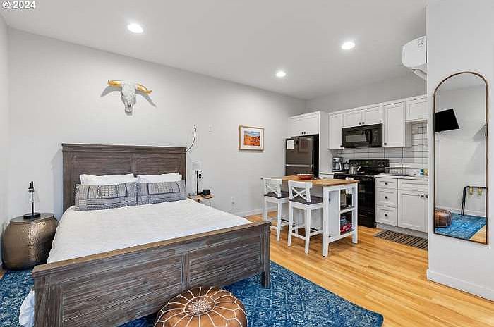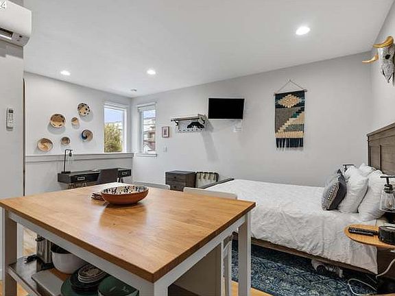 Move in ready. All utilities included in listing price. Studio available this July in North Portlands popular Boise neighborhood. This apartment is an ADU above a garage with a private and separate entrance and address. The studio has quick access to Legacy Emmanuel, Moda Center, I-5, and a short drive downtown. Free parking on the street with no parking restrictions. As you enter you step into a small mud room, and then head upstairs to your cozy and fully furnished living space. There's also a private patio that is yours to enjoy. The main living space is set up with a queen bed, a tv for movie nights, a full kitchen, a small island with 2 bar seats, fridge, microwave, and electric stove and oven. Comes full of all your kitchen necessities including pots, pans, cooking utensils, dishes and a drip coffee maker. There is a mini split AC and heater and hardwood floors. The bathroom has a stand up shower, storage, and in unit laundry. The studio is in a popular neighborhood with lots of cute restaurants and coffee shops within walking distance. Our street can be crowded during the weekends but not loud. Mississippi Ave is also a short walk away. The closest Max stop is the Overlook yellow line, as well as the Vancouver/Ivy bus line (4,24,44) This is a privately owned unit so please reach out with any questions. We'd love to make your stay as comfortable and smooth as possible. Utilities included: water, power, gas, garbage. Pet deposit is $250 and monthly pet rent is $30 unless it is a service animal. We allow up to two animals. No smoking on property. First months rent is due at signing and a security deposit of $1000. Short term, long term, and month to month OK. Screening criteria include a credit check, rental history, and background check in compliance with Portland's Fair Access in Renting (FAIR) ordinance. All utilities included in rent total (Water, Power, Gas, WiFi) Pets allowed with a refundable pet deposit of $200. Service animals are not subject to pet fees or deposits. Street parking only. No parking on premises or in alley. This is a non-smoking property. Cigarette smoking is prohibited inside the unit and in common areas.
