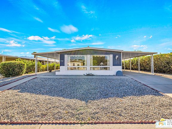 Step back in time to this original manufactured home in the coveted Palm Desert Greens Senior community. This home still has that groovy vibe from another time. The home features a large great room , a separate den or additional living space, a breakfast bar, kitchen with some Harvest gold appliances. There is a large primary bedroom with en-suite bath and walk in closet. A hall bath can be used by guests and the second bedroom. Laundry area is adjacent to the kitchen. The large side patio is easily accessible from the Den and is fully covered. The tandem parking is on the opposite side of the home. Come and check out all this active community has to offer- golf, tennis, pickleball, fitness room, clubhouse, restaurant, shuffleboard, bocce, and a library! This home is waiting for someone to make it their own and discover a few vintage treasures inside.
