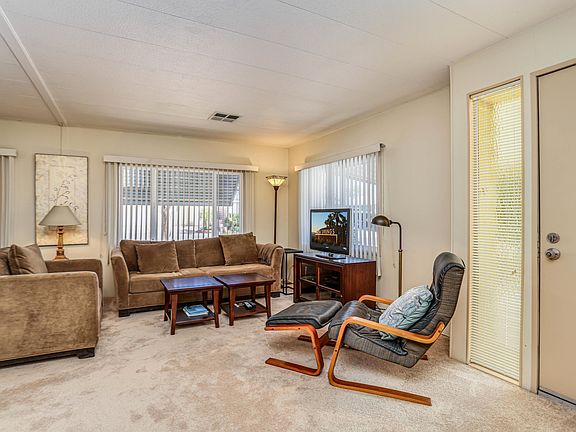 REDUCED! This is a wonderful 2 bedroom 1440 sq. ft. manufactured home situated on one of the most attractive streets in the extremely desirable 55 + community of Palm Desert Greens. The well cared for home has been recently upgraded with living room carpeting, refinishing of cabinets, new stove top and hood, dishwasher, lighting, designer fan. The patio is finished resembling tile, and there is a permanent built shed/workshop in the carport. Included in the low $290 HOA are: 24 hr. guarded gate, free golf, fitness, Bocce Ball, Pickle Ball, Card room, billiards, pools, tennis, trash pick up and basic cable. The clubhouse offers a restaurant that serves a wide variety of dishes. This home is secured to the foundation, allowing conventional financing and you own the land!