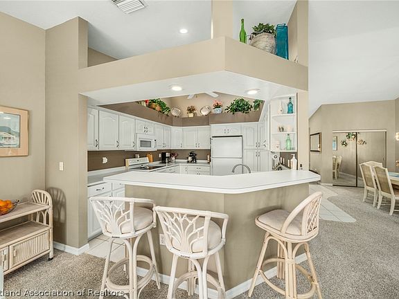 This condo/villa in Norstar Cove is light, bright and open with stunning views of Lake Granada. This home is well maintained, squeaky clean and, fully furnished and MOVE-IN READY! The open floorplan features cathedral ceilings a dining area in the "great room" and a kitchen overlooking the living area. It opens to a Florida room with views of the lake. A sliding door from the dining area opens to your lakefront patio where you'll enjoy watching sunsets over Lake Granada. The large kitchen features a breakfast bar, ample counter space and cabinets and a pantry. The spacious Master suite has a large walk-in closet and bathroom with dual vanities and a walk in shower, and Master flooring is less than 3 years old. The second and third bedrooms are nicely sized, with one currently set up as an office. Plenty of room for vehicles and toys in the full sized two car garage! And the indoor laundry is conveniently located. This home is walking distance to the golf course clubhouse and Island View Restaurant. Sun n Lakes offers two championship golf courses, a recreation complex with community pool and exercise facilities, tennis, pickleball and shuffleboard. And of course, your condo association has its own inground pool. This is a great home for care-free living, perfect for a seasonal get away or full time residence. The Association fee includes exterior insurance, exterior maintenance, pool service, landscaping and a capital reserve. All the units are getting new roofs in the next few weeks! See this home today!