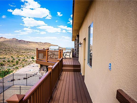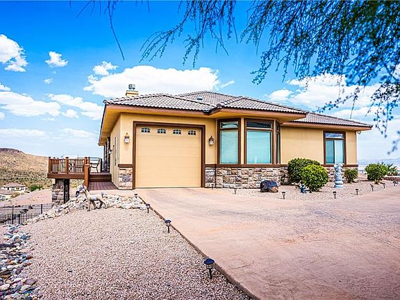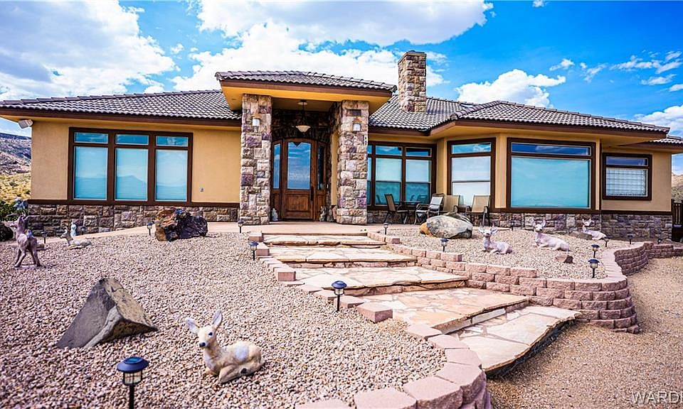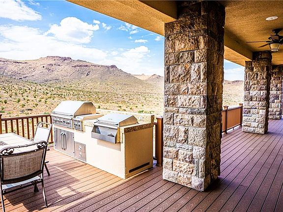 Look no further if you're desiring to live in luxury and comfort. This custom home nestled in the Cerbat Mountains boasts just over two acres with low-maintenance desert landscaping, large wrap-around trex decking, outdoor fireplace with cozy patio area, outdoor ceiling fans and exterior speaker system surrounding the home. Breathtaking views from nearly every room in the home are just one the unique features of this property. Inside one will find solid stained wood doors throughout, granite counter tops, custom built-in cabinetry, large walk-in pantry, multiple dining areas, living area fireplace with a serene waterfall feature above. The home has many luxurious features such as separate his and hers bathroom vanities in the master bath with heated floors beneath, a large jetted tub, walk-in shower with automatic temperature control and instant hot water. A large guest master suite includes a full bathroom with a walk-in closet, along with a door with functional sidelites that open to the wrap-around deck area with unobstructed scenery views. The spacious media room with large projector includes plenty of reclining seating for entertaining, along with a lavish wet bar that includes commercial grade cooling for beverages. An additional two bedrooms designate space for guests or family to enjoy their own space. The central storage room serves as a repository with shelving and a built-in safe. An attached single-car garage facilitates convenient parking, while the detached three-car garage means plenty of space for vehicles, toys, and an RV. This dreamy property has been very well maintained and has too many extravagant upgrades to list. Come tour your luxury escape today!