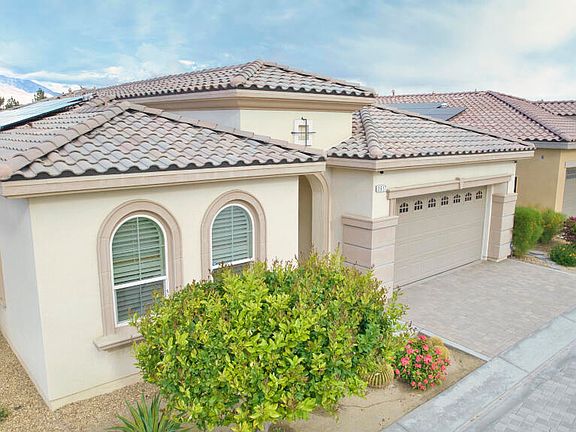 Welcome to Villa Portofino, the valley's prime location for an Active Adult Community. This single family detached home is a true masterpiece. Once you walk through the front door you will see that there has been no expense spared. Custom tiled floors greet you as you enter. Professionally painted and wallpapered walls throughout. Crown molding and custom panelled doors. Built in media cabinets in the office and great room. A reimagined kitchen that makes you believe you are in a New York Penthouse. The master suite has been turned into a palatial getaway with floor to ceiling silk curtains, professionally laid wallpaper on the walls and ceiling. The master bath has been redesigned with a private salon, elegant lighting fixtures, extra storage and a built in vanity. The master closet is a clothing designers dream with a designated shoe and purse storage section and an entire room that looks like you're in a Rodeo Drive private salon. The guest room has a private feel with shutters, window treatments and a private bath. The patio has snow capped mountain views, mature citrus trees and a very private setting. The two car garage has a dedicated A/C unit, multiple storage cabinets and an epoxied floor. With owned solar panels you can expect to save a substantial amount of money on your electric bills. The Clubhouse is only a minutes walk away. While there you can catch a movie in the 100 seat theater, workout in the gym, swim laps and dine in one of the 2 restaurants.