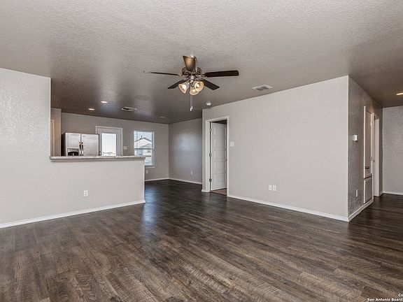The property features an open floor plan, complete with a breakfast bar and an eat-in kitchen, outfitted with all stainless steel appliances, including a refrigerator and micro hood. Wood vinyl flooring extends throughout a majority of the home. Nestled in a private neighborhood, it offers convenient access to IH 10 East and is just a short drive from downtown San Antonio.