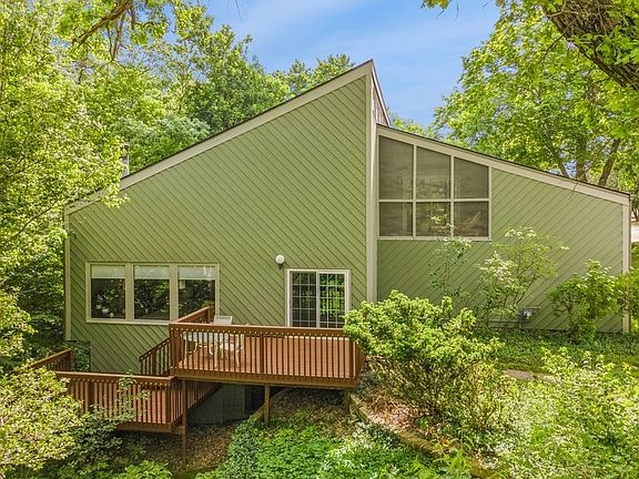 Tucked into a private NW subdivision, this contemporary modern home offers peaceful living on a beautifully wooded .4-acre lot w/a scenic walking trail on association grounds. Built in 1975, the home features timeless architectural elements in over 3000 SF , including vaulted ceilings & a striking floor-to-ceiling brick fireplace that anchors the open living/dining area. The kitchen features newer quartz counters & stainless steel appliances, including a casual eat-in space. A hard to find on-grade entrance to the spacious garage with 1/2 bath nearby. Step outside to the expansive back deck surrounded by flowering trees and low-maintenance perennial gardens, ideal for relaxing or entertaining in a tranquil setting. Upstairs, a generous loft area sits beside the primary suite, which includes a large soaking tub, walk-in shower, dual-sink vanity, and walk-in closet, extra storage. Off the suite, a cozy screened porch offers a peaceful spot for morning coffee or evening breezes. The finished walkout basement extends the living space w/a comfortable family room, two additional bedrooms, a 3/4 bath, laundry area, and utility room. New roof in 2019 and gorgeous roller blinds on the main floor. Newer basement carpet and washer/dryer are included. Exterior paint completed last year and decks are newly stained. New septic. With its private setting, thoughtful layout, and nature-infused views, this home is a rare find near Ames. Dues include garbage, road maintenance & park funds.