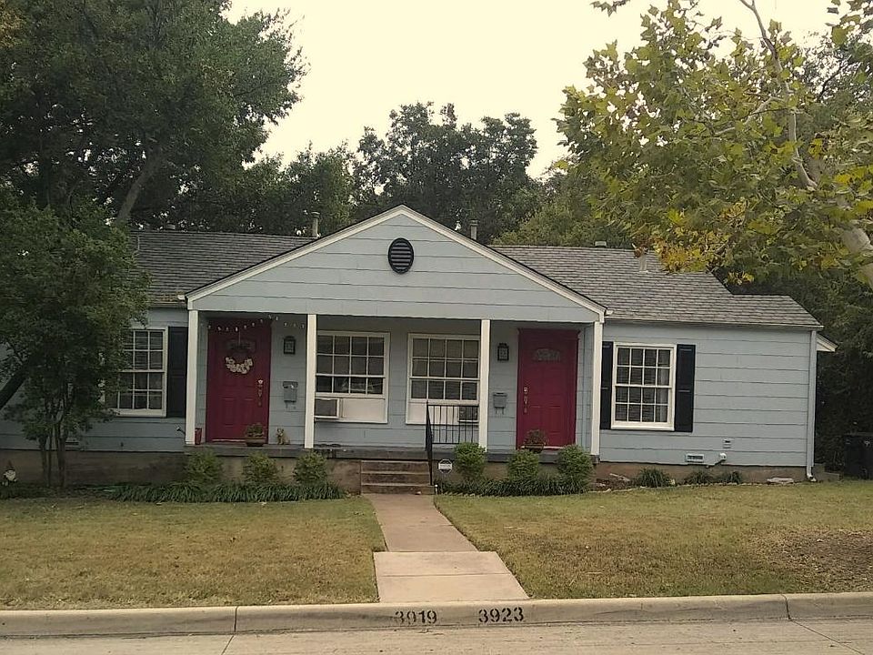 ** LEASE PENDING ** The Museum District is a highly desirable area: north of I-30 at Montgomery Exit, a few blocks south of Camp Bowie. Very close to Dickie's Arena and Will Rogers complex, with excellent access to I-30 and downtown. Craftsman-era cottage (duplex) from 1944 with many original details like glass doorknobs and a porcelain-tile bathroom floor. All doors have keypad entry. Cable ready. Wired for security system. Oak laminate flooring. Will be completely repainted; help choose the new paint color! Window units and ceiling fans in every room for cooling. Heating is from a central 'fireplace' in cherry wood (photo). It's small, but everything fits: - Living room: sofa, love seat, coffee table, small bookcase, entertainment center. - Bedroom 1: King bed, nightstand, chest *or* twin bed, nightstand, desk, chest. - Bedroom 2: Roughly the same size. Great for an office. - Kitchen: equipped with refrigerator, stove, microwave/vent, laundry center (W/D), disposal. You can add a breakfast table, and your full-sized washer & dryer if you prefer your own. - Bathroom: Excellent storage in tall linen closet behind door (photo) - Large coat closet for storage. - Exterior storage unit (photo) The shared walls are the living room and office / second bedroom. Your duplex neighbor is a quiet professional. We can talk about pets under 20 pounds. Sorry: no fence. No smoking/vaping indoors. Some pictures are old; will update as soon as I can. Will be completely repainted. I promise to take this post down when an application is pending, but it can take 24-48 hours for the changes to take effect. I provide lawn service. You pay for utilities; I'll give you contact info. Application fee is $40; covers credit and background check. Deposit equal to one month's rent due at lease signing. First month rent due at move in. We can talk about small pets under 20 pounds.