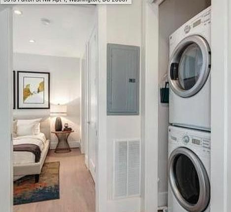 Sleek modern open plan, bi-level condo in convenient but tranquil neighborhood. Open-plan living/dining/kitchen on the first floor with 2 spacious bedroom each with en-suite bathrooms. A de-luxe master bath with tub. Equipped with W/D. A small balcony. Dedicated parking in rear. Only 6 units in the building. Owner pays for parking and gas, water Tenant pays for Electricity, Cable, Internet