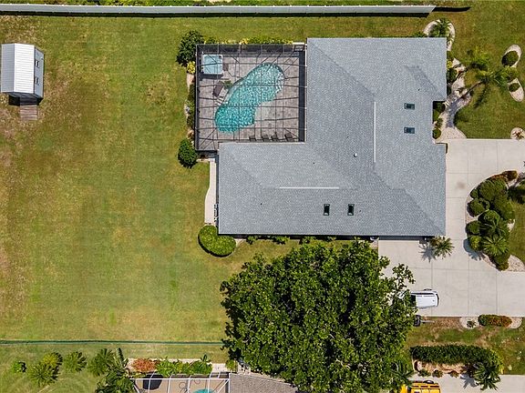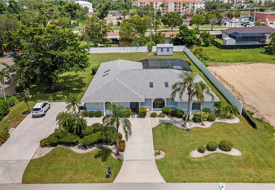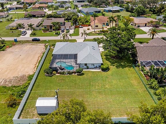 One-of-a-kind property featuring four oversized lots totaling over half an acre, located at the heart of Cape Coral. Huge backyard, perfect for recreational activities or storing your boat, trailer, camper, or cars, complete with a permitted hurricane-rated 10x16 storage shed. The pool's South-Eastern exposure ensures it stays warm throughout the year, allowing for enjoyable swims in the shaded areas in the afternoons, reducing strain on the pool heater. As you step inside, you'll be greeted by a top-notch renovation with new kitchen features, bathrooms, tiles, and more. The abundance of square footage and distinctive home layout provide ample space for growth. This property checks all the boxes with convenient pool bath access, easy pool entry from the kitchen and living room via sliding doors, a guest bedroom with a bathroom, numerous walk-in closets, extensive storage options, an oversized lanai with brick pavers, a pool water feature, and a pass-through window for effortless outdoor entertaining. Let natural light flood in through the living room and kitchen skylights, complemented by automatic solar blinds. Enjoy the modern touches like granite and quartz countertops in the kitchen and bathrooms, plywood cabinets, a custom-built entertainment center, a newer pool, cage, AC, hot tub, new appliances, and more. This property is a must-see to truly appreciate its charm and would be perfect for a large family or investor. Roof 2022, AC 2016.