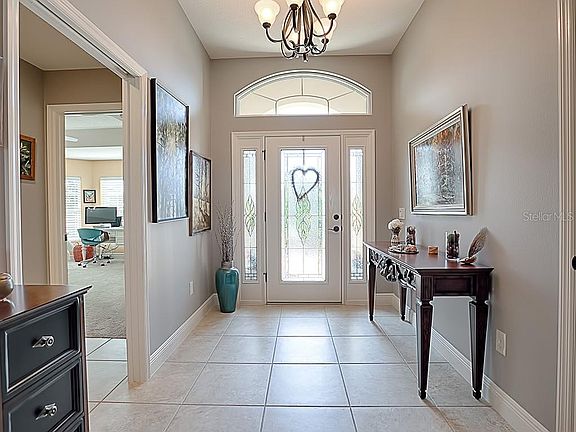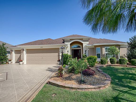 This stunning 3 Bedroom 3 Bath stretched Zinnia Floorplan is located in Osceola Hills on the beautiful Belle Glade Championship Golf Course. You will notice the curb appeal the moment you pull up, upgraded landscaping, painted driveway, and epoxy coated garage floors. As you enter the home through the leaded glass door entry, you will be in awe of the beautiful view of the pool and the golf course. This home is loaded with extras, 2 bedrooms with their own ensuite baths, tile and hardwood flooring, (carpet in the guest bedrooms) upgraded cabinets and appliances, designer paint colors, garage and golf cart garage stretched forward 4 feet, with enough room for all of your toys and even a coat closet in the entry. The kitchen is a chef's delight with granite counters, cabinets with pull outs, upgraded stainless appliances and a coffee bar. The saltwater pool is heated with waterfalls, a beach shelf for your beach chairs, and plenty of room to do your laps or just float away your day. Your laundry room has been designed as a separate room with built-in cabinets and a sink. You will want to see all of this for yourself! Don't wait, make your appointment for a private showing today!!
