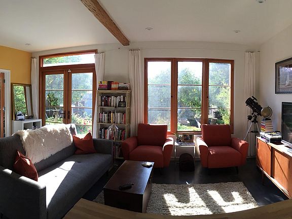 Beautifully designed, light filled 730 sq. ft., very large newly built 1 BR in-law, near border of Berkeley/Kensington. The bedroom is about 12 feet x 17 feet. The unit overlooks the backyard and surrounding wooded hillside with windows on three sides. This elegantly designed space has a contemporary architectural style with high ceiling, it's unfurnished, and it's the first level to a 2-story family home. The entrance is through the backyard French door, with 2 steps between street level and the backyard. This space is uniquely situated in walking distance of urban offerings providing beauty, light, serenity and easy access to public transportation. Perfect for couples and telecommuters. This space was designed with intention and attention to details. We are looking for someone who will enjoy and care for this space, has a healthy lifestyle, is considerate of others and values this community A deposit of $1,000, and first and last month rents are required. One year lease. Tenant pays $200/mo ($300/mo for two) to cover electric, gas, water/sewer, garbage/recycling and wifi service. Please email us with your phone number and a few lines about yourself, your work or studies, interests and credit rating for arranging a viewing time. FEATURES: - Open floor plan, high ceilings and architectural lighting - Very large bedroom (~12'x17' equivalent to area of two bedrooms) with two hanging closets - Great open kitchen with stainless steel appliance and granite countertop, including gas range, convection oven, full size fridge, ventilation hood, disposal, and two tall pantry cabinets - Laundry closet with washer & dryer and additional storage - Radiant floor heating - French limestone and exposed concrete bathroom with European fixtures - Large custom, unpainted wood windows and French door - Backyard right outside your door with lockable gate, a Meyer lemon tree that never quits!, large seating area, a large raised bed garden that you can use to grow vegetables. - Street parking, for periods when tenant is out of town, tenant can park in the tandem driveway. - Sorry, no smoking, no pets - Max occupancy is two people TRANSPORTATION: (Car independent) - San Francisco commute via Transbay Express bus; stop is in two blocks - El Cerrito Plaza BART station is 5 min Bus/drive or 15 minute walk - Berkeley Downtown/UCB/LBNL within 10-15 minutes via bus; stop is in two blocks SHOPPING: (Shop locally) - Within 2 blocks: Colusa Circle Market with organic produce & meat, Benchmark gourmet pizzeria, Semifreddi's bakery/coffee, Circus Irish Pub, Sunday Farmer's Market, Gym, Spa and more ... - Nearby shopping: Lavender Bakery, ACME Bread, Trader Joe's, Monterey Market, El Cerrito Natural Foods, Tokyo Fish Market ... LEISURE: - Tilden Park's vast outdoors is 5 minute drive up the hill, or just start your hiking/biking right outside within the neighborhood hills. - Solano Ave. in 15 minute walk: Major shopping district with many restaurants, coffee shops, win shops, bistros, boutiques, ... One year lease. A security deposit of $1,000 and first and last month rents are required. Tenant pays $200/mo ($300/mo for two) to cover Electric, Gas, Water/Sewer, Garbage/Recycling and WiFi services. None smoking.