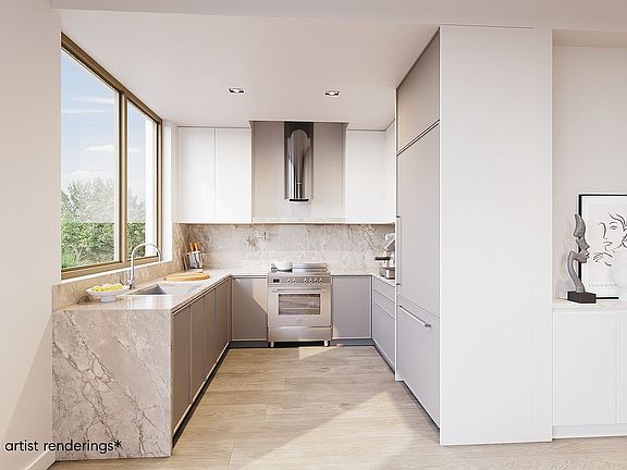 A semi-private landing welcomes you to this 641-square-foot luxury home, where oversized windows capture glorious natural light amplified by pale 10-inch-wide hardwood floors and nearly 10-foot tall ceilings. Relax and unwind in the spacious living/dining room, or step out to the stunning 12-foot-wide covered terrace for al fresco dining and lounging alongside eastern views. Inside, the European gourmet kitchen offers upscale custom cabinetry, sleek Dekton countertops, and high-end appliances, including a vented Bertazzoni range and a refrigerator and dishwasher by Miele.
