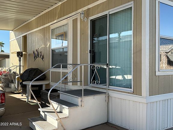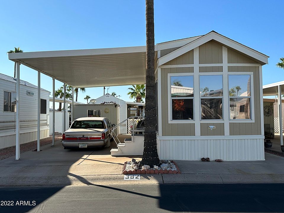 GORGEOUS 2013 Cavco perfectly situated NORTH FACING W/ INCREDIBLE Superstition MOUNTAIN VIEWS! Great curb appeal w/ stone board siding, EXPANSIVE carport area makes parking easy & allows for PLENTY of room for outdoor entertainment! HIGHLY DESIRABLE open floorplan w/ U-shaped kitchen ideal for the chef in you. UPGRADED COUNTER TOPS w/ FULL SIZE STOVE,MICROWAVE & STAINLESS STEEL SINK. VERY LARGE PANTRY perfect for all your storage needs. GREAT QUALITY natural colored CABINETS along w/ nice CLOSET SPACE in this one! Dual pane windows w/ BEAUTIFUL PULL DOWN SOFT SHADES, LIGHT & BRIGHT with LARGE WINDOWS to enjoy your AMAZING VIEWS. SPACIOUS bathroom w/ oversized linen storage space, nice size vanity w/ LARGE MIRROR offering a CLEAN walk in SHOWER! Cozy bedroom w/ expansive closet space & plenty of dresser drawers below. TILE LOOK laminate flooring w/ TASTEFUL neutral colors. HIGH VAULTED CEILINGS gives large open feel! BEAUTIFULLY MAINTAINED, this BEAUTY is a MUST SEE! Additional outdoor storage shed great for all your hobbies and a place to store your extra items. OWN THE LAND...OWN THE FUN! COME be a part of our 55+ RESORT! BED DOES NOT CONVEY. NOT ALL ITEMS in shed to CONVEY.