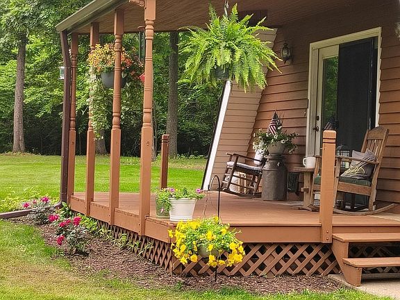 Attractive fireplaceTwo carpeted bedroomsSpacious two-car detached garageNewer rear deckSurrounded by peaceful woodsExtra lotLovely open front porch