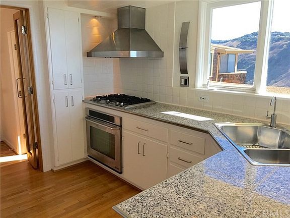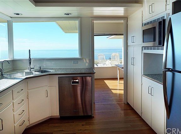 Beautiful mid century modern single level panoramic ocean view home at the top of the peak above North Laguna Beach. Very private, views forever, large ocean view decks. Hardwood floors, all new kitchen, new baths, new paint (unfurnished). Living room fireplace, open living area, dining area. Sliders open to the wrap around ocean view deck. Bathroom is marble and clean and white and new. Kitchen is granite, new white cabinets, and stainless appliances. Landscape is being restored to a native habitat, elements will include a dry creek, a decomposed granite sitting area with shade sails, microclimates like a butterfly garden, meadow, and chaparral. Also included is the detached 2 car garage. The third bedroom has laundry machines are in the closet. A rare opportunity to live at the top view point and most private lot of all of Laguna Beach. This is the blank canvas in which you may create your most amazing home. Drive up the steep driveway to the garage and front door, or park below on Lookout and walk up the front stairs to the deck.