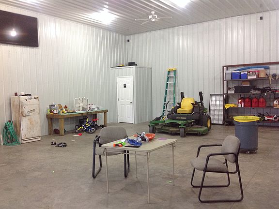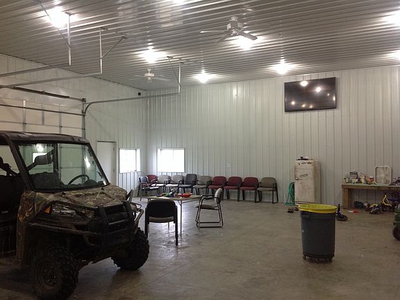 5.3 acres and large lake (strip pit) come with this 5 year old home. 5 bedrooms, 3 baths and full walk-out basement. Kitchen has tiled floor and back splash with Parks custom built Maple cabinets and stainless appliances. Master bath has a tiled double shower, tile around the jetted tub, double vanity and large walk-in closet. Family room, kit. & 3rd car garage in basement to keep the mower and yard equipment. Also has a storm shelter room. A building was added in 2013; the 42 x60 structure was built to the nines with soffit, gutter and an inside liner. The building is fully insulated with cellulose blown insulation with R40 in the walls and R60 in the ceiling. The automotive lift pictured is a Challenger. Dolby 7.1 surround pre wired in walls. This building comes equipped with 200 amp underground service. The large over head door is on the west side with potential for large RV or boat storage. The partially covered dock pictured comes with encapsulated black floats, spring board and swim deck. The dock is approximately 24 x 30.