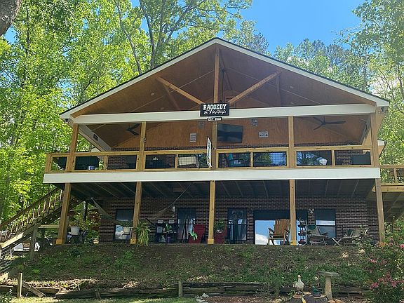 Beautiful home on the lake! Captivating views from deck, perfect for entertaining or relaxing, and equally beautiful views from large patio on terrace level. Family room w/stone fireplace, cathedral ceiling and wall of windows and doors. Charming original vintage kitchen with lots of cabinets & storage. Owners suite with walk in closet and ensuite bath. Terrace level features great room w/fireplace, library/office, bedroom and full bath. Private deeded lot w/acreage, double RV parking pad w/full hookups and lower level driveway w/garage.