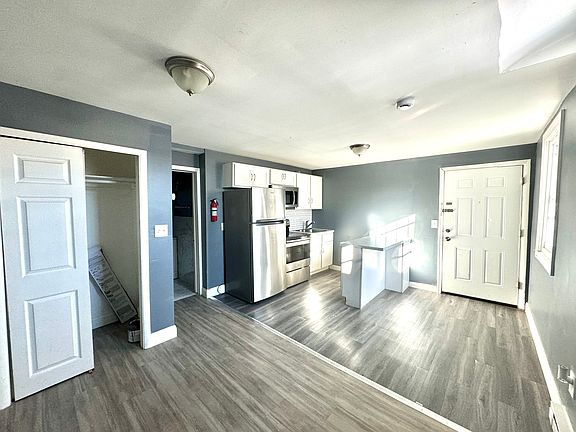 A comfortable studio featuring modern, condo-grade appliances and a kitchen island. It includes a spacious bathroom and abundant natural light.