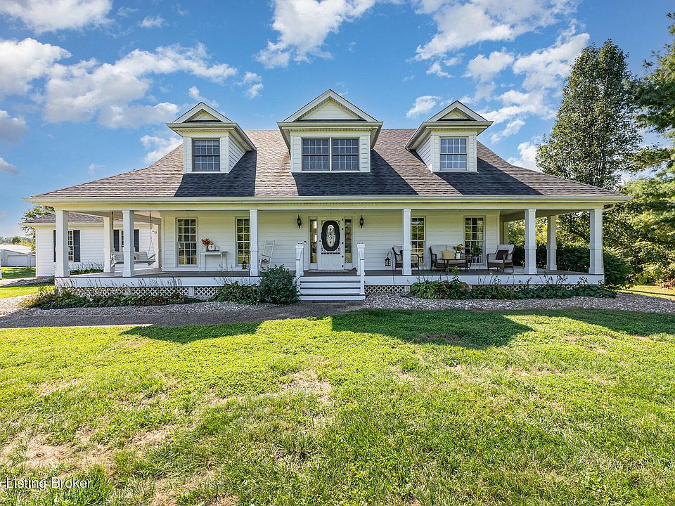 A little slice of country. in the country. This late 20th century farmhouse with large covered almost wrap around front porch sits on 2.38 acres in Oldham County. With amazing outdoor space and an above ground pool, there is privacy to be found but still within 10 to 15 minutes of city amenities. Located between Lagrange and Shelbyville, Kentucky. With a first floor primary bedroom, large open, great room to the kitchen, flowing into the dining room and large foyer. The first floor also has an office for those working from home. Additional bedrooms and full bath complete the second floor. A full unfinished basement with exterior access and plenty of storage. Don't miss this modern country farmhouse! With the mudroom/laundry room, Butler pantry, large kitchen, large living room, hardwood floors throughout everything has first floor living with visitor space on the second floor. Resting on 2.38 acres. Not far from Lake Jericho