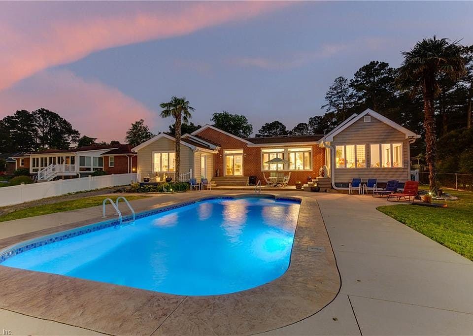A Must See! Waterfront! Tidal water to the Elizabeth River. In the heart of Western Branch. Beautifully updated 4 BDS/3.5 BTHs w/attached enclosed sun room, inground pool, 2 sheds (one w/outdoor sink great for fishing, front + back porches, all have electrical), Gazebo. Large eat-in kitchen w/ 2 sinks, double oven, minifridge addition, and 3 different prep areas, quartz counters. 4th bedroom/den w/pocket doors, fireplace, and has a huge bathroom w/separate shower + large jetted corner tub, cathedral ceiling and it even has it's own entrance to back yard oasis. Sunken FLR, Large sunken FR that is open to the kitchen. Primary bathroom has dual sinks, large closet, jetted tub, separate shower, cathedral ceiling + sun lights. Other bedrooms are spacious. Attached sunroom heated/cooled has a mini fridge, sink and cathedral ceiling. Pool has a gas heater, newer liner, salt system, well for pool and gardening, parking in back for RV. water heater 2022, roof 2023. 2024-09-18