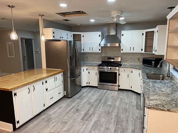 4/2 (Anglewood) Welcome to this charming home nestled in a peaceful community, conveniently located near shopping centers, the University of Florida (UF), delightful restaurants, and beautiful parks. This residence boasts a welcoming ambiance thanks to the majestic live Oak trees gracing the front yard and the inviting covered front porch. Upon entering, you'll be greeted with a spacious living room adorned with brand new vinyl plank flooring, elegant bay windows that flood the room with natural light. The open-concept living and dining area creates a warm and inviting space for both relaxation and entertaining. The kitchen is a chef's dream, featuring custom white cabinets that offer ample storage and a bright, airy atmosphere. The adjacent dining room is tastefully appointed with custom paint, wainscoting, and a chair rail, creating an inviting space for enjoying meals with family and friends. The generously sized master bedroom boasts a substantial walk-in closet, ensuring you'll have plenty of space to organize your wardrobe. The master bathroom is both functional and stylish, with abundant cabinet and drawer space, a double-sized tiled shower stall, and a separate toilet room for added privacy and convenience. An added bonus is the extra-large converted second master bedroom with its own entrance, providing flexibility for various living arrangements or potential use as a guest suite. The hall bathroom offers a comfortable tub and tile shower combination. Step out onto the back deck, where you can relax and take in the tranquil views of the privacy-fenced backyard. The utility room is conveniently located off the living room. Don't miss the opportunity to make this beautiful home your own, where comfort, convenience, and charm come together in one perfect package.