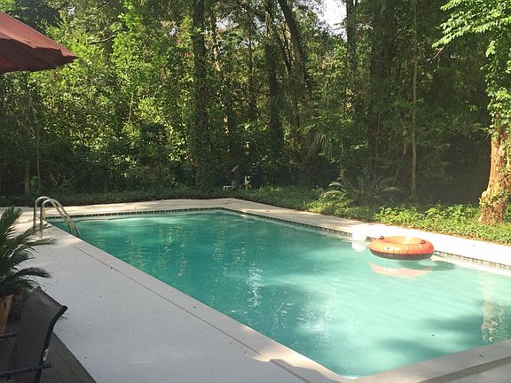 Bike to UF! This recently updated 4-bed/3-bath Pool home is just the place to plant your family for your next life chapter. The front door opens into a cozy entryway with formal living room on the right, and straight ahead through a lovely dining area to a light and bright family room with classic woodburning stove and large sliding glass doors leading to the deck and pool out back. Updated kitchen features designer dark-stained cabinets and light-colored countertops, black appliances, and plenty of storage space. A generous laundry room sits just off the kitchen. Each bedroom offers plenty of floor space and a generous closet. The master bath features a beautifully tiled standing shower; the hall bath features a tiled tub-shower combo and long single-sink vanity. Outside, a separate pool bath features a toilet and tiled shower with curtain. Lovely deck area accompanies the serene pool and expansive yard. Sip your Sunday morning coffee and watch the deer that often wander through the yard. Additional home features include recently replaced windows, plumbing, and electrical panel. The pool was most recently resurfaced in 2016. Walking distance to nearby parks.