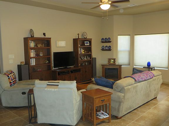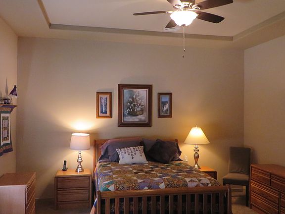 This is a charming townhouse in a small gated senior community. Amenities included are a club house, swimming pool and hot tub and walking trails. It is convenient to three golf courses, shopping ,fitness center and transportation. It is located on a premium corner lot directly across from the clubhouse and pool. It has a great floor plan with upgrades including refrigerated air, ceiling fans in all rooms, recessed ceilings, 10" Great Room ceiling and a large master bedroom. Granite countertops are found in both kitchen and bathrooms. There is ceramic tile flooring in common areas and carpet in the bedrooms. French doors lead out to a comfortable covered patio. The garage features a finished floor with ample shelving for storage as well as a key pad opener. The bathrooms feature tiled showers as well as designer light fixtures. The Whirlpool /Frigidaire appliances convey.