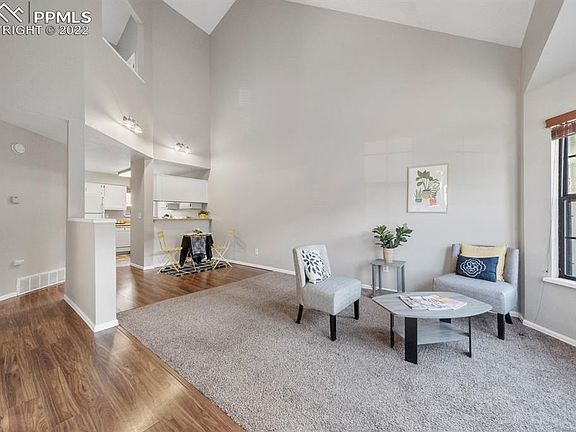 Welcome Home to this super cute move in ready Townhome! This 2-bedroom, 2-bathroom, 1,050 sq ft townhouse has so much to offer! The vaulted ceilings make the whole place feel open and the large front windows allow for plenty of natural light; making the living area feel bright and cheery. This lovely home had a full interior paint and the carpets were professionally cleaned just before being listed. This home is equipped with Central Air and is ready for you to come call it home! And the location is perfect, perfect, perfect. Located just off Nevada/HWY115 and Cheyenne Meadows Rd you’re literally minutes from shopping, Ft. Carson, Downtown Colorado Springs and it is just a quick drive to I-25. The kitchen has ample counter space as is open to the living room, perfect for when you’re entertaining! You can be preparing food and drinks and still connect to the fun. The main level bedroom is just off the living room with a Jack-and-Jill style ¾ bath and has access to the large back patio featuring built in seating a storage closet. The bedroom on the 2nd floor is the master. It’s spacious with lots of natural light, a with a walk-in closet and the full bath adjoins. Come see this gem today!
