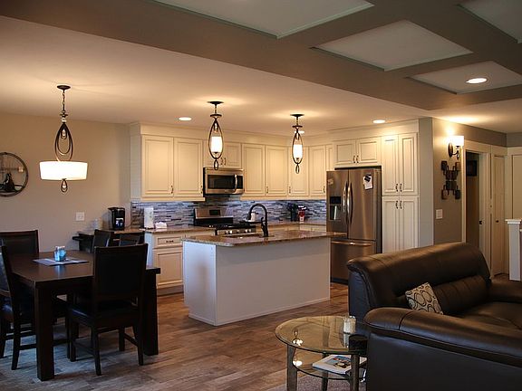 Beautiful two bedroom condo in great location. Open floor plan creating a very spacious feel. Large master suite with two walk-in closets. Custom shelving and built in shoe rack. Kitchen includes high end cabinetry with quartz countertops, glass tile, under cabinet lighting and stainless appliances. Finished lower level including rec room, second bedroom and full bath. Spacious laundry room with built in ironing board. Expansive storage area as well. (including above garage) Epoxy garage floor. Association dues include, snow removal, trash, recycle, lawn and water.