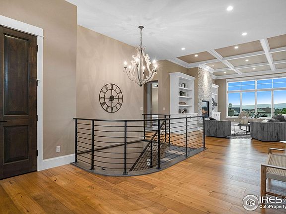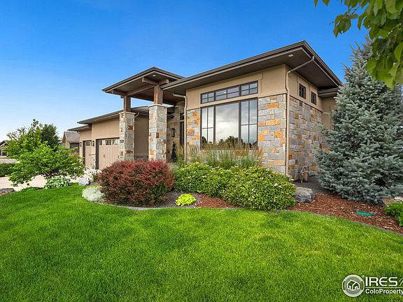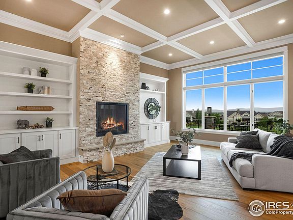 Welcome to your spectacular view of the Rockies! Warmth and luxury abound in this sprawling custom ranch with an open floor plan and finished walkout basement backing to greenspace. Richly-appointed with hand-scraped hardwood floors, coffered ceilings, a stunning gourmet kitchen, and a generous great room with floor to ceiling stacked stone fireplace flanked by beautiful built-ins. The dining area opens to a covered composite deck with an outdoor gas fireplace perfect for cozying up on crisp Colorado evenings and watching the sun sink down behind the mountains. You'll love the intelligent layout boasting a main floor study and guest suite, as well as the owner's suite - which has a large walk-in shower and soaking tub, and a walk-in closet opening to the laundry. Finished basement has a gorgeous wet bar and an additional gas fireplace and is ideal for entertaining inside or outside on the covered patio. Three additional basement bedrooms and 2 bathrooms, one of which is ensuite round out this thoughtfully laid out home. Exclusive Harmony Club is just minutes from Fort Collins and offers a neighborhood pool and clubhouse, workout center, restaurant, pavilion, and numerous sports courts including pickleball, tennis, and basketball. Golf membership is optional.