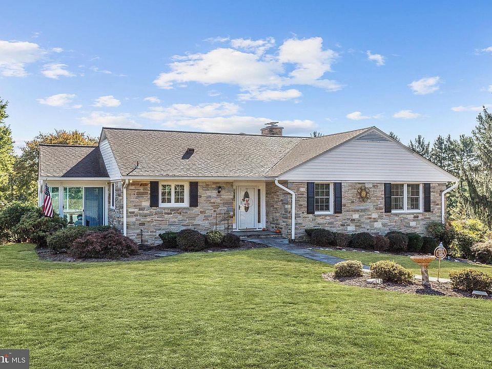 Wonderful opportunity to own this beautiful all stone ranch style home in desirable Dunloggin! Nearly an acre of beautifully landscaped grounds including stone walkways and a flagstone patio. Interiors accompanied by hardwood flooring and recessed lighting. Spacious living room features a wood-burning stove flanked by built-in bookcases as well as a large picture window overlooking the rear yard. Separate dining room leads to three season sunroom complemented by a Dutch door. Kitchen offers a tile backsplash and cabinetry with roll-out shelving. Three main level bedrooms and two full baths including an en-suite master bath. Master bedroom highlights dual closets. Lower level showcases a fourth bedroom, walkout family room, workshop and a large laundry/ mud room combination. Oversized two car side-loading garage and walk-up attic that runs the length of the house. Property Updates: Recessed lighting, interior paint, lower level flooring, ceiling fans, dining room chandelier, dishwasher, and more!