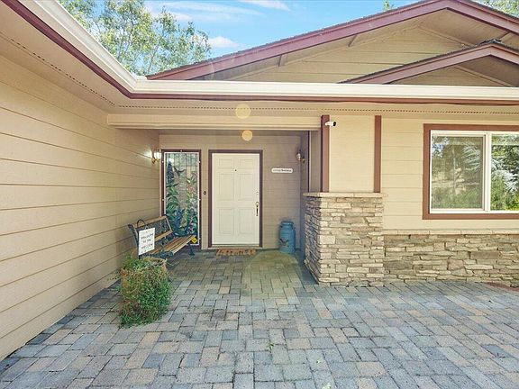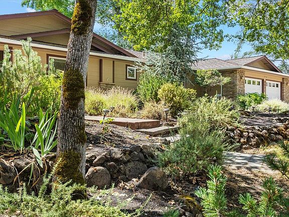 This stunning 4-bed, 3-bath country home with attached garage, just minutes from town, offers panoramic views and modern upgrades. The primary suite boasts a large walk-in shower and closet with its own private deck. The chef's kitchen features an island, 5-burner gas cooktop, convection oven, and wine fridge. Set on 5 acres of meticulously landscaped grounds with TID irrigation, enjoy grapevines, fruit trees, raised beds, a year-round pond, and an inground solar-heated pool. Entertain on the expansive patio or relax by the cozy gas fireplace. A circular wall of windows encases the living room with breathtaking views. The property also includes a shop with 1,344 sq. ft. and 220V, studio, greenhouse, and single detached garage, plus solar panels to offset energy costs.