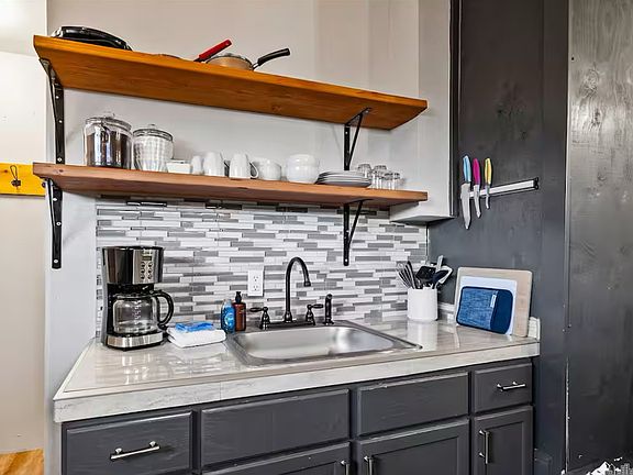 There is NO kitchen. It is a kitchenette with a sink, microwave, toaster oven, fridge/freezer, and coffee pot.