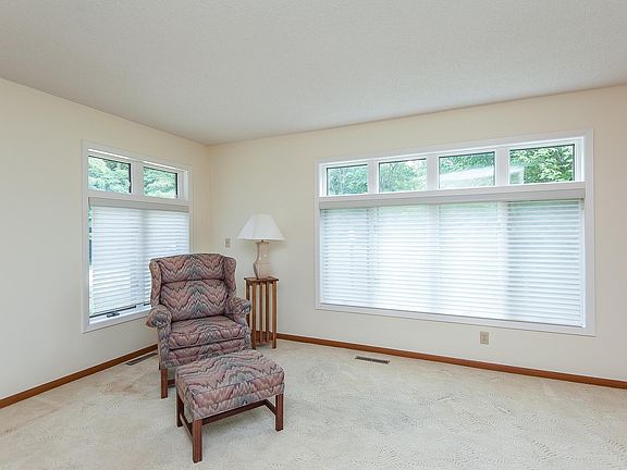 WHAT A VIEW! This walkout ranch is located on a private, wooded, cul-de-sac with panoramic views. The welcoming open concept main floor with updated kitchen is perfect for entertaining. Enjoy the views of the lush backyard from the sunroom just off the dining room. With a vaulted wood ceiling, floor to ceiling windows, and a built in reading nook you will never want to leave! Take a stroll in the private back yard and pick some apples off the numerous apple trees located throughout the property.