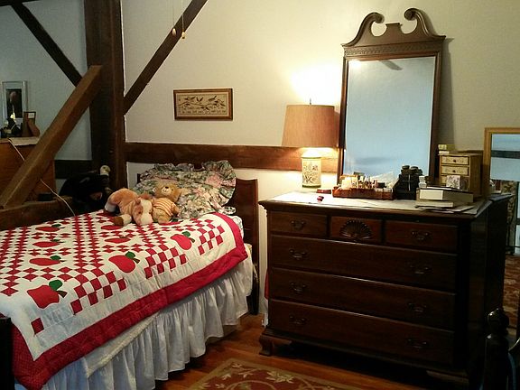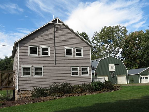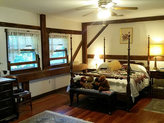 Unique, unusual -A PIECE of HISTORY! MAGNIFICENT 1870's POST & BEAM barn conversion has an open floor plan, original stone walls & exposed beams! Surrounded by over 17 acres! There are also TWO OUTBUILDINGS: a 30x48 pole barn as well as a 24X24 garage PLUS 3000 square feet of living space! The updated kitchen has stainless steel appliances & hardwood floors, both full baths have been updated AND a new half bath in the master (could be revised for addition of shower) A woodstove, wetbar & slider to patio make the family room retreat a potential "in-law" area w/ bdrm & bath nearby! MUST SEE!!