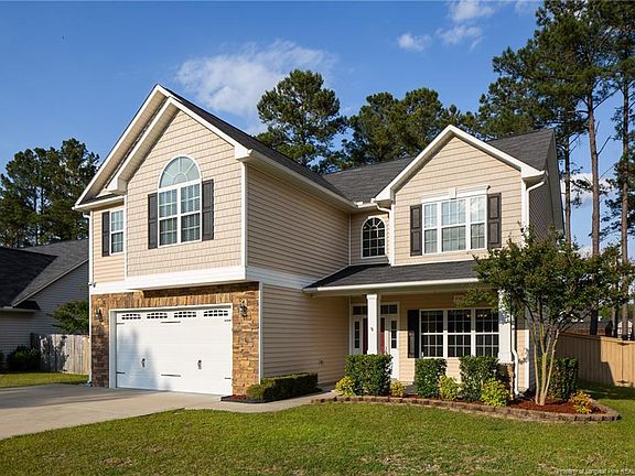 Winning! Your home search is over! 2 story home waiting for you to call home in Jack Britt High School District. Pretty is an understatement for the curb appeal of this house with stone veneer, fresh landscaping, extra parking pad, front porch, and shake vinyl siding on the front. Walk into a 2 story foyer and formal dining room with laminate flooring. Gas fireplace and surround sound in the living room. Big kitchen includes breakfast nook, SS appliances, crown molding, tile backsplash and great views of a picture perfect back yard. Back yard is surrounded by a privacy fence and includes 2 patios, a firepit, storage shed, dog kennel area, and a screened in porch. It's perfect for relaxing or entertaining guests! Spacious master bedroom with cathedral ceiling, two WICs, garden tub, and a shower with a seat. The laundry room with a sink and cabinets is between all four bedrooms. Make an offer today!