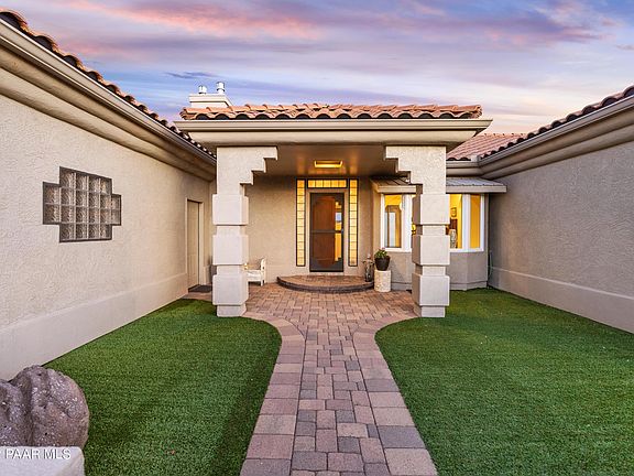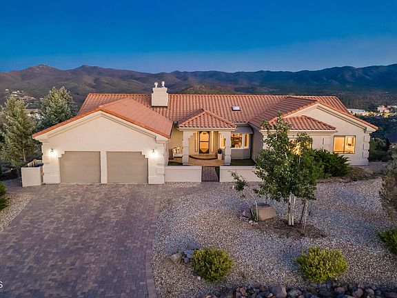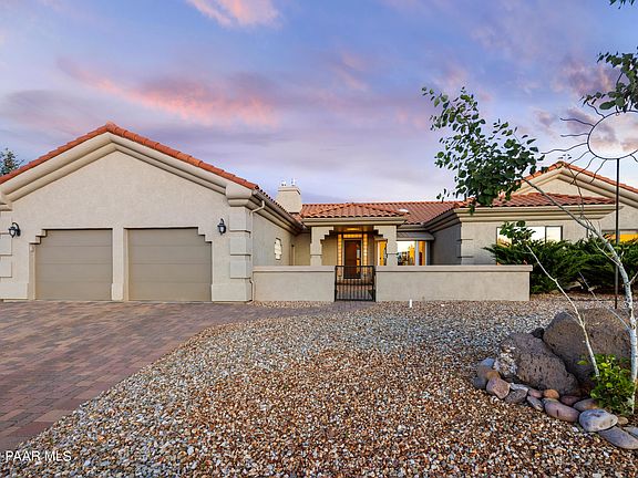 Situated on a prime elevated lot on a sleepy cul-de-sac with nearly 270 degree views of Glassford Hill, Bradshaw, Mingus and Granite mountains, national forest, and even Lynx Lake! This home boasts outstanding curb appeal, elegant paver driveway with paver pathway meandering up to the beautiful, gated courtyard entry. Low maintenance tile roof, mature trees in the front yard, security screen upon entry. The home offers an open, split bedroom floor plan & great room design concept that features main level living/master on main. Soaring vaulted ceilings, skylights for abundant natural light, recessed lighting, elegant corner gas fireplace with blower on remote control has floor to ceiling dry stack stone hearth and wood mantle. Upon entry you're greeted by a wall of windows on the south side of the house to enjoy the sweeping panoramic views from great room, kitchen, owners suite, and AZ room, complimented by gorgeous engineered hardwood flooring. Kitchen boast engineered stone quartz countertops that extend to the base of the cabinetry above, Jenn-Air 5 burner cook top, Kitchen Aid stainless steel wall oven, updated LG refrigerator and Bosch dishwasher. Antique white cabinetry with beautiful crown molding, lots of custom pull outs, spice racks and abundant functional storage, skylight and plenty of seating for entertaining. The owners suite on the main level is spacious in size, wonderful views, second corner gas fireplace for cozy cool nights. The en-suite bath consists of dual vanities, tile floors, oversized jetted tub, contemporary walk-in shower with beautiful tile with dual showerheads. Massive walk-in closet with automatic lighting has direct access to the laundry room which features upper overhead cabinetry, closet and deep utility sink, laundry also doubles as a mud room/key drop area coming off the garage. There are three additional bedrooms on the main floor, one is extra spacious in size, views of Granite Mountain, ceiling fan, pleated shades and three closets. There is a spacious guest bathroom which has a comfort height toilet, dual vanity, tub/shower combo and integrated storage. The other two bedrooms are currently configured as offices but could easily be bedrooms, all have great views and a central closet that was opened up for access between the two is an easy convert back which would provide each with a walk-in closet. Also on main is a powder room with pedestal sink for entertaining guests.The south side of the house has a massive covered composite deck with beautiful tongue and groove ceiling and outstanding views. Natural gas is plumbed in for a built-in barbeque, enclosed Arizona room is not included in the square footage but can be used year-round, has retractable shades and adds an extra "outdoor" living space protected from the elements. Lower level is perfect for extended stay guests or extra room for occupants, there is an additional living room and covered patio with great views, two additional bedrooms plus full bathroom with raised height solid surface vanity and comfort height toilet. There is more though! Looking for a workshop? There is an unfinished +/- 475 square area with concrete pad, power and lights that would make for great hobby enthusiast plus another +/- 500 sq. ft of dry storage for seasonal items! Oversized two car garage with custom floors, has wifi enabled openers and access to the courtyard via side entry door to adjacent courtyard entry! Lastly, if you're looking for even more space, the Seller owns the parcel behind the home that they would sell as well for $80,000!