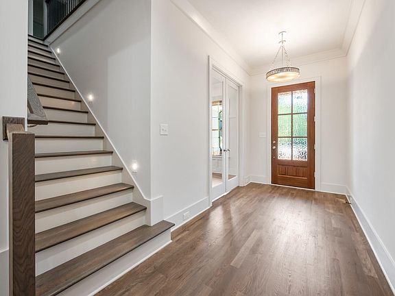 This new construction home, built by Brandywine Homes and designed by McMillan Design, offers over 3,000 square feet of living space with 4 bedrooms and 4 bathrooms. Stained wood doors open to the main floor, which features an open-concept living area with site-finished hardwood floors. The primary bedroom is located on this floor and features exposed wood beams. The suite includes a large walk-in closet with built-in shelving and a window seat. The primary bathroom is a luxurious retreat with a freestanding tub, a glass-enclosed walk-in shower with dual shower heads, and a dual vanity. The family room has a fireplace with built-in dark cabinetry and floating shelves, and it opens to a spacious screened-in porch with a vaulted wood ceiling and a ceiling fan. The kitchen has a blend of light and dark cabinetry and includes a large two-tiered island, a wall oven, and a microwave, along with a scullery/pantry. The main floor also includes a private study, and a three-car garage. The second floor has three additional bedrooms, a hall bath, two private full baths, and a large game room, as well as plenty of walk-in floored storage.