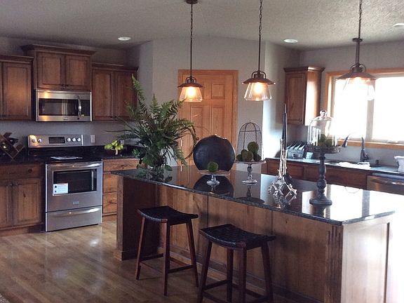 Stunning raised ranch style home with 180 degree view of the beautiful city lights and Black Hills. This breath taking home has been elegantly finished with a huge open great room with tall ceilings, recessed lighting, solid oak six panel doors throughout and an absolutely amazing dream kitchen. Custom Kitchen with knotty Cherry cabinets, fantastic 4' x 9' gourmet cooking / entertainment island with remarkable granite counter tops, stainless appliances including new wine refrigerator, side by side refrigerator, electric range oven. Top of line bronzed fixtures throughout have been carefully chosen to accent the space. Spacious 13x20 master suite with extraordinary views offers a big 8x12 master bath w/ two separate custom vanities, granite counters and bronzed fixtures. Done by a master tiller you will fall in love with the double walk in shower natural massaging rock flooring, custom glass doors. Huge walk-in closet with skylight awaits your choice of closet design. Main floor also features a finished laundry room with granite top deep bowl laundry sink and cherry cabinet. Lower level offers a wonderful theater room, wet bar area with mini fridge and the additional third bedroom is designed as an additional master suite with huge walk-in dressing room/ walk-in closet adjoining a third bathroom. New windows done in 2015 to take full advantage of one of the most spectacular views of the city lights and Black Hills. Paint colors have been carefully chosen to accent this amazing home. Colors and staging done by Master Consultant from Eclectic Living specializing in Colors, Design and Staging.