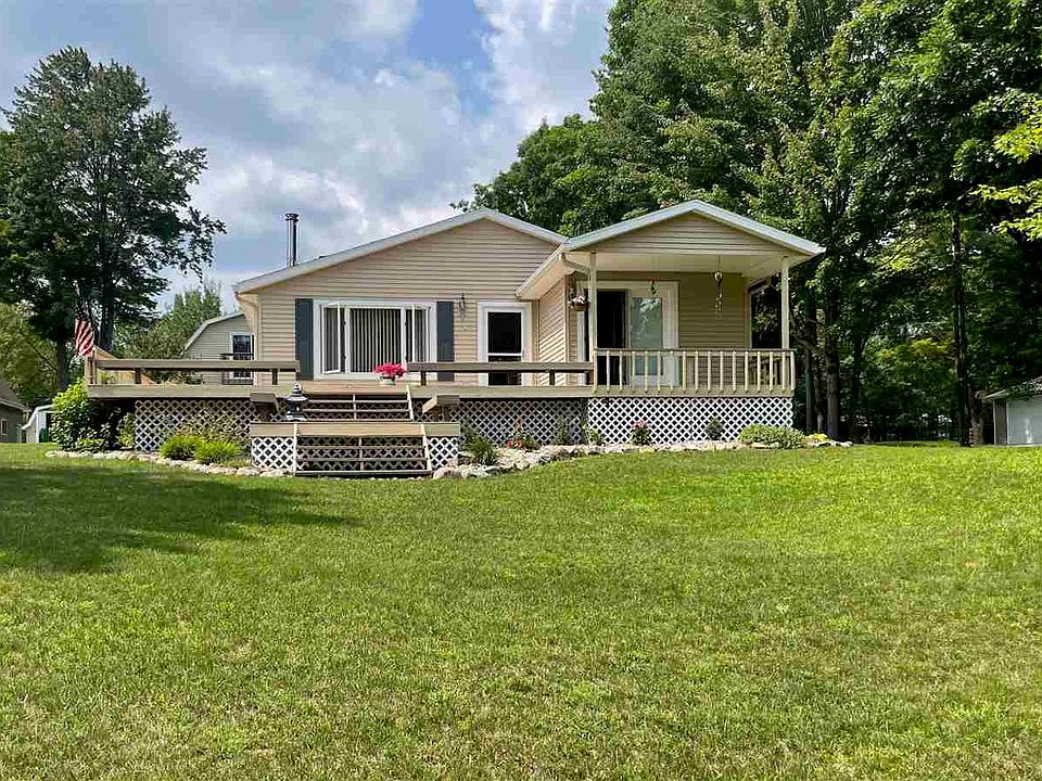 Picture Perfect Waterfront Home on Secord Lake. This 2 bedroom 2 bath home is meticulously maintained and move in ready. Enjoy 71' of waterfront with sand beach area for swimming, fishing and kayaking until the lake level returns. Beautifully landscaped yard. Open floor plan with vaulted ceiling & skylights makes it bright & airy. Nice size kitchen with plenty of cabinetry, pantry and peninsula counter. Living room with high ceiling, large wood windows, wood burning stove with great views overlooking the water. Large wrap around deck for entertaining. Master bedroom has double closets and a patio door out to the deck. Bedroom 2 is spacious for family or guest. Nicely and neutrally decorated with new LVP flooring. Natural gas furnace with A/C. 3 car garage with a bonus bunkhouse with 1/2 bath & kitchenette. Great for sleeping extra guest. Newer pole barn with 3 overhead doors, one that accommodates an RV. Storage for all the toys. Just 2.5 hrs from the Detroit area.