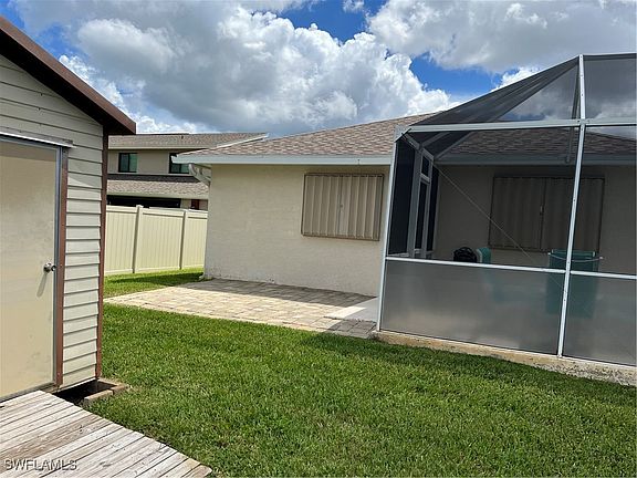 WELCOME HOME...Your new Home features a newer roof 2022, central AC replaced 2018 WITH ALL ASSESSMENTS PAID!!! ALL WINDOWS and SLIDERS have accordion shutters. Located in Central SE Cape Coral, convenient to everything cape coral has, and only 5 miles from the NEW Pickleball plex with 32 courts. The yard has a privacy fence also a shed to keep yard equipment in and keep your garage clean. The home has a spacious and open floor plan, perfect for family gatherings and entertaining guests. Additional upgrades vaulted ceiling, very spacious pool lani and pool bath for convenience to keep floors dry and safe. This home is a must-see for anyone looking for a comfortable and stylish living space in a very central location.