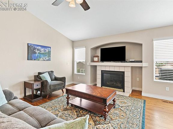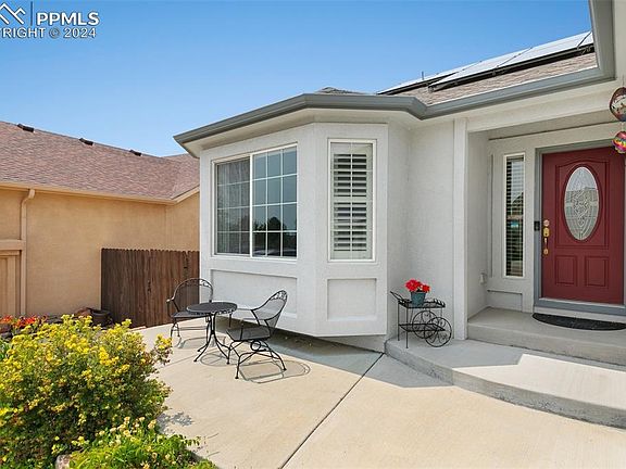This immaculate home is main-level living at its best! The open floor plan provides both comfort and functionality, and the high ceilings allow the space to fill with natural light. The warm hardwood floors throughout the main level blend in harmony with the accents of granite and stone in the great room and kitchen. The great room features a gas fireplace and tv niche. The spacious kitchen has granite countertops, stainless steel appliances, and a large island with breakfast bar. There are two options for dining: the formal dining room and the sunny breakfast nook with walk-out to the upper deck. From there, you can take in the stunning front range and Pikes Peak views and see for miles! The main level master retreat shares those fabulous views and has an adjoining bath with dual vanities, oversized shower, and walk-in closet. A second main bedroom and updated full bath offer a comfortable space for guests. The finished walk-out basement gives you all the entertaining space you need, including the family room with custom built-in entertainment center with wiring for surround sound. Two more bedrooms and another guest bath round out the lower level. The back yard is a private oasis with 6' privacy fence, expanded lower patio, lush landscaping with fruit trees, and a storage shed for all of your gardening tools. This home shows pride of ownership and other special amenities include solar panels, central air, a 2-yr old roof, main level laundry, radon mitigation, high-speed internet, central vac, and garage with workshop space.
