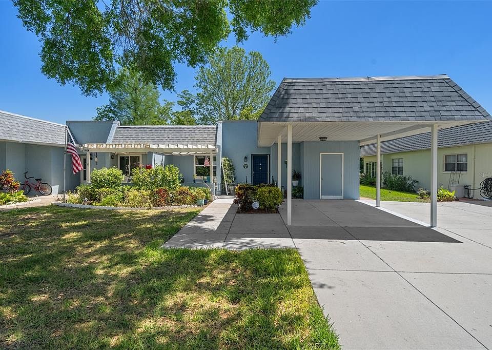 Welcome home to your freshly painted, beautifully updated condo in the gated community of Seven Springs Golf and Country Club with great view of the 13th hole from the front patio. 2-bedroom, 2-bathroom with bonus sunroom. Kitchen has updated stainless steel appliances and quartz countertops. Master bedroom with good-size walk-in closet has beautiful French doors that lead to the sunroom. Updated master bathroom with bright quartz countertop and walk-in shower. Second bathroom also has new bright quartz countertop and refinished bathtub and new tile flooring. New tankless water heater in attached storage unit. Dining room has gorgeous modern light fixture included! There is ample parking space with the long driveway, room to park four to five cars! Sit on the front patio and enjoy the sunset. The beautifully gated front patio also has an awning and beautiful view which overlooks the 13th hole of the Executive Course. Home warranty transfers until August 2025. The monthly condo fee includes guard at gate, cable, exterior maintenance to include grounds, roof, exterior of building and pest control, also sewer, water, trash and escrow reserve fund. There is also an optional social membership for an extra fee if you wish to include golf (two courses available). This unit is NOT REQUIRED to pay the social fee! If desired, though, the social fee allows access to the restaurant, gym, two swimming pools, tennis and pickleball court and more activities. Don't miss out on this one!