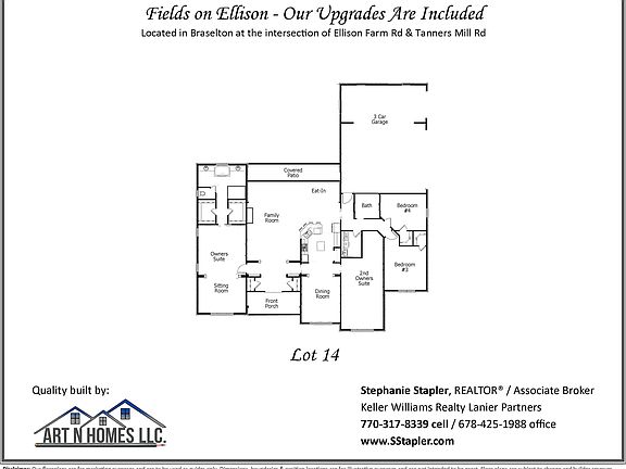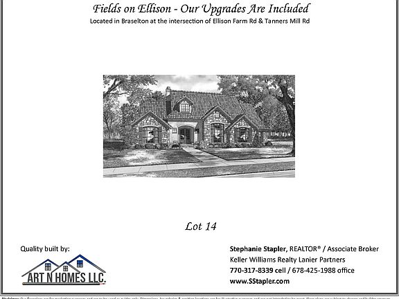 Call Stephanie Stapler at 770-317-8339 to see if this property is still available and arrange a showing or for information about How to sell a home in Northeast GA Art N Homes delivers high-quality ranch home, build time is 90 days from contract to close. Stock photos used to show finishes. Sizable ranch, split bedroom plan with 4 bedrooms and 3 full baths including roomy 2nd Owners / Guest suite all on 1 level. Distinctive family room has 12 ft coffered ceiling and floor to ceiling fireplace. Extra large formal dining room with coffered ceiling. Beautiful kitchen is open to Family room and has stainless appliances, granite tops to include breakfast bar, pantry & eat-in area. Owners suite with high trey ceiling is supreme w/sitting room, spa-like bath along with his & her walk-in closets. 2nd Owners / Guest Suite with walk-in closet & owner's style bath with separate garden tub and tiled shower. Rocking chair front porch & covered back patio. 3 car side entry garage on .82 acre lot in Fields on Ellison Subdivision. Located in Hall County at the intersection of Ellison Farm Rd & Tanners Mill Rd in Braselton, convenient to I-85 & I-985 with a quick commute to Northeast Georgia Medical Center in Braselton. Quality Built by Art N Homes - Our homes come standard with all the upgrades most communities charge extra for including: premium trim package, coffered, vaulted & trey ceilings, 9'+ ceilings on main and smooth ceilings throughout, hardwood floors in common areas on main, tiled floors in bathrooms & laundry room, granite counter tops in kitchen & baths, stainless steel appliances including the refrigerator, 42" kitchen cabinets, tiled back splash in kitchen, bronze plumbing, hardware & electrical, 2" window blinds, automatic garage opener, architectural shingles & covered back patio. Marketed by Stephanie Stapler, Realtor / Associate Broker with Keller Williams Realty Lanier Partners 770-317-8339 www.SStapler.com Directions: From Atlanta - I85N, L At Exit 126 - Hwy 211, R on Hwy 53 - Winder Hwy at red-light, L on Tanners Mill Rd, R on Ellison Farm Rd, Subdivision is on the L