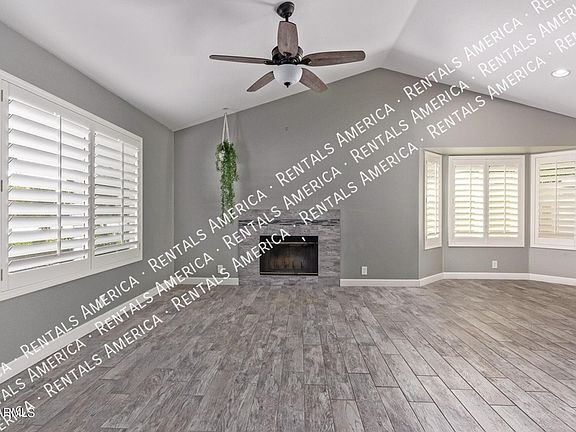 Feel at home with this charming 4-bedroom home that is sure to captivate with its elegant interior, featuring vaulted ceilings, wood shutters throughout and wood-look tile floors. The spacious great room, complete with a cozy fireplace, creates a warm and inviting atmosphere. The kitchen is a cook's delight, equipped with chocolate-stained cabinets, stainless steel appliances, granite counters, a handy pantry, and a delightful bay window. Retreat to the serene main bedroom, offering a private bathroom with dual sinks for convenience. The peaceful backyard is perfect for relaxation, boasting a covered patio, a lush grassy area, and ample space for outdoor activities. *One Time Admin Fee: $300, Pet Deposit: $300/pet (if applicable), Service Fee: 2%. $39/month Resident Benefits Package* Helping Heroes Discount Available! ONE DOG 35LBS OR LESS OKAY.