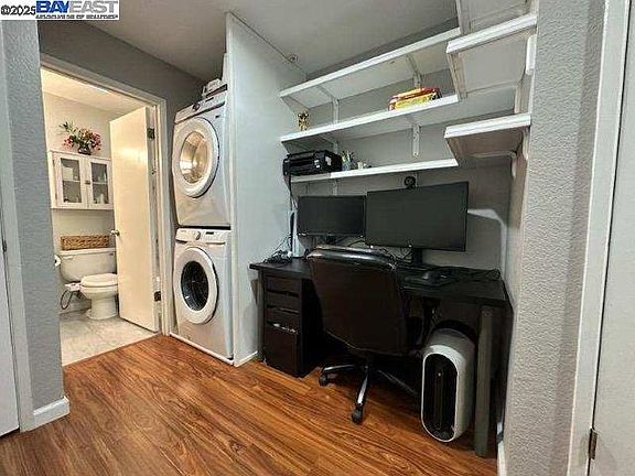 Welcome to this wonderful condominium unit in the highly desirable and exclusive Adobe Hills community. Featuring an open floor plan, recessed lights, granite, ss appl., induction over and newer cabinets in kitchen, office space created where laundry was, laminate flooring throughout, with tile in bathroom, fireplace, in-unit laundry with washer and dryer staying, custom closet organizers, private patio/balcony and an abundance of natural light. HOA amenities include swimming pool. hot tub, tennis courts, club house, and underground parking with additional storage. Centrally located in Fremont just minutes to BART, Lake Elizabeth/Central Park, Washington or Kaiser Hospital, Fremont Main Library, medical offices, shopping, restaurants, and more. Commute access to I-880, I-680, and Dumbarton Bridge. Tech buses stop close by for commuters.