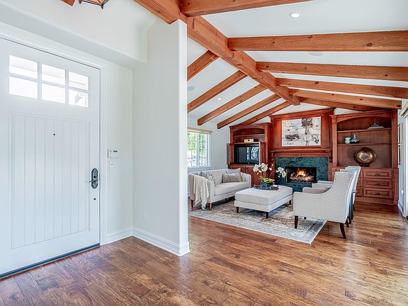 Single Story located in sought after First Neighborhood. You might think you're in North Ranch with all this home has to offer. Gorgeous landscaping & charming curb appeal will make you want to linger. As you enter the front door so much more awaits. Dual pane picture windows provide a view of a back yard oasis. Raised open beam ceilings, vintage hickory 5'' hand scraped wood floors w/ lovely fireplace & built in cabinetry will invite you into the living Rm. Master retreat is well appointed w/ his & her custom closets with pull down second story clothing racks. Enjoy spa-like master bath w/dual sinks, vanity, solar tubes, lots of storage & two person steam shower. Expanded kitchen has views of the serene outdoor space. This chef's dream boasts a large walk in pantry, Viking appliances w/ warming drawer, granite counters & hobby area. Secondary bedrm is set up as home office w/ builtin desk, entertnmnt center & storage. Resort type backyard w/ tumbled pavers is just the place to unwind. 22 ft gazebo w/ 2 built in gas htrs, 2 fans, gas fireplce, retractable awnings & outdoor kitchen. Salt water pool w/swim current will keep you in shape. Detached 8X12 She-shed/wrkshp. Over $400k 2009 remdl includes new roof,HVAC, plumbing, & finished garage w/epoxy flooring