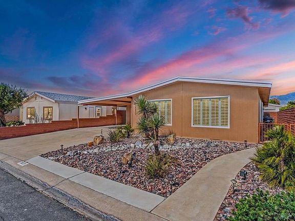 Incredible quality upgrades & gorgeous private patio! This beautiful 2-bed 2-bath home with striking curb appeal sits on a permanent foundation with 433 certificate, offering stylish & comfortable living. The modern kitchen features granite countertops, pull-out cabinets, soft-closing drawers, recessed lighting & brand-new stainless steel fridge. The large primary boasts a custom closet with built-ins & both bathrooms have been tastefully remodeled with large tiled showers. Enjoy year-round comfort with dual-pane windows, ceiling fans, crown molding, plantation shutters & newer central A/C, plus an eco-friendly evaporative cooler. Tile flooring & fresh paint inside & out add a crisp, clean feel throughout the home. A dedicated laundry room provides added convenience. Outside, relax under the spacious, private covered patio surrounded by lush landscaping plus low-maintenance artificial turf. A charming ''she shed'' offers space for hobbies or storage. The large driveway includes covered parking, plus separate golf cart parking with its own charging station. This move-in-ready home is perfect for modern desert living. PD Greens is an active adult community offering golf, tennis, pickleball, fitness, swimming & 24-hour security, all for the affordable monthly amount of $400.