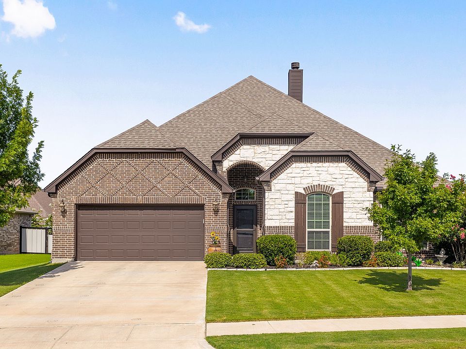 Beautiful single-story home w charming brick & stone exterior & meticulously landscaped front & back yards. You are greeted by stunning hand-scraped hardwood floors that lead to a thoughtfully designed split bedroom floorplan & a versatile office space (4th bedroom) Open concept kitchen seamlessly flows into the living area. Kitchen boasts elegant granite countertops, SS appliances, gas cooktop, & spacious center island. Primary bedroom is a luxurious retreat w serene views of the backyard. Ensuite bath features separate vanities, a generously sized walk-in shower, relaxing garden tub, linen closet, & an expansive closet. Separate utility room provides practicality, and mudroom w built-in storage offers a convenient space. Step outside to the covered patio & low-maintenance stone landscaping. Home is equipped w smart light switches, security system, & sprinkler system, all of which can be controlled from your phone. Home offers both elegance & practicality. It's truly a must-see!