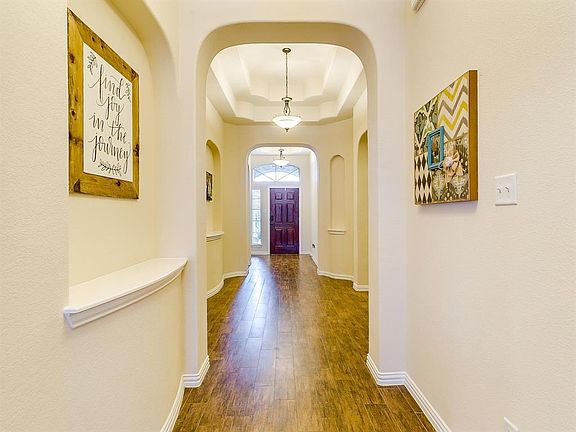 Absolutely beautiful home located in Ranches East in Northwest ISD. Pride of ownership is evident the minute you arrive. The inviting entry features beautiful wood flooring, arched walkway, & coffered ceiling. The spacious family room is open to the gorgeous kitchen & dining area. The kitchen is a dream with granite counters, upgraded cabinets, SS appliances, large breakfast bar & plenty of cabinet & counter space. The master is split for extra privacy. Master bath includes a jetted tub, separate shower, large walk-in closet & access to the utility room. Three additional bedrooms are all nice size. The backyard is great for entertaining with a covered & open patio as well as room for the kids to play.